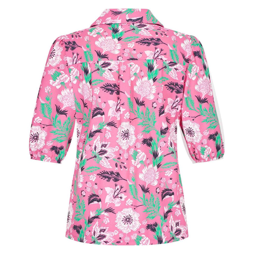 Pink/lyserød bluse med all-over-print, skjortekrave, bredere midt på ærmet, knappelukning.